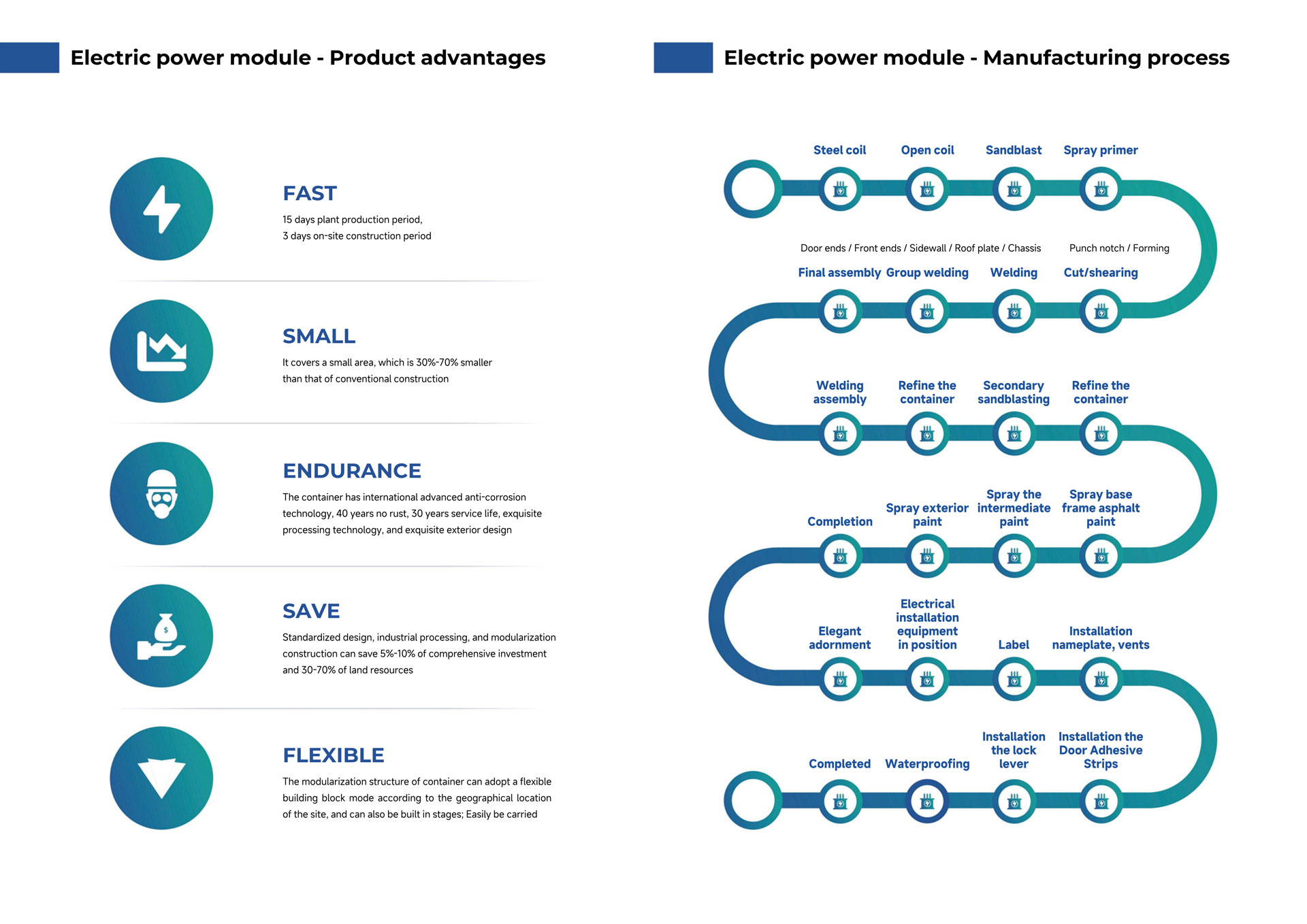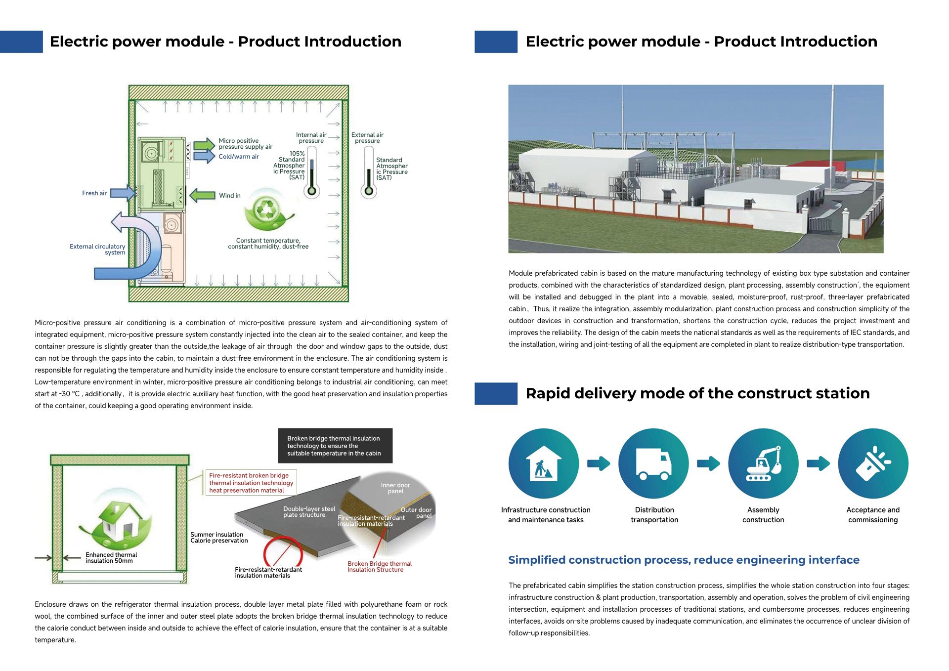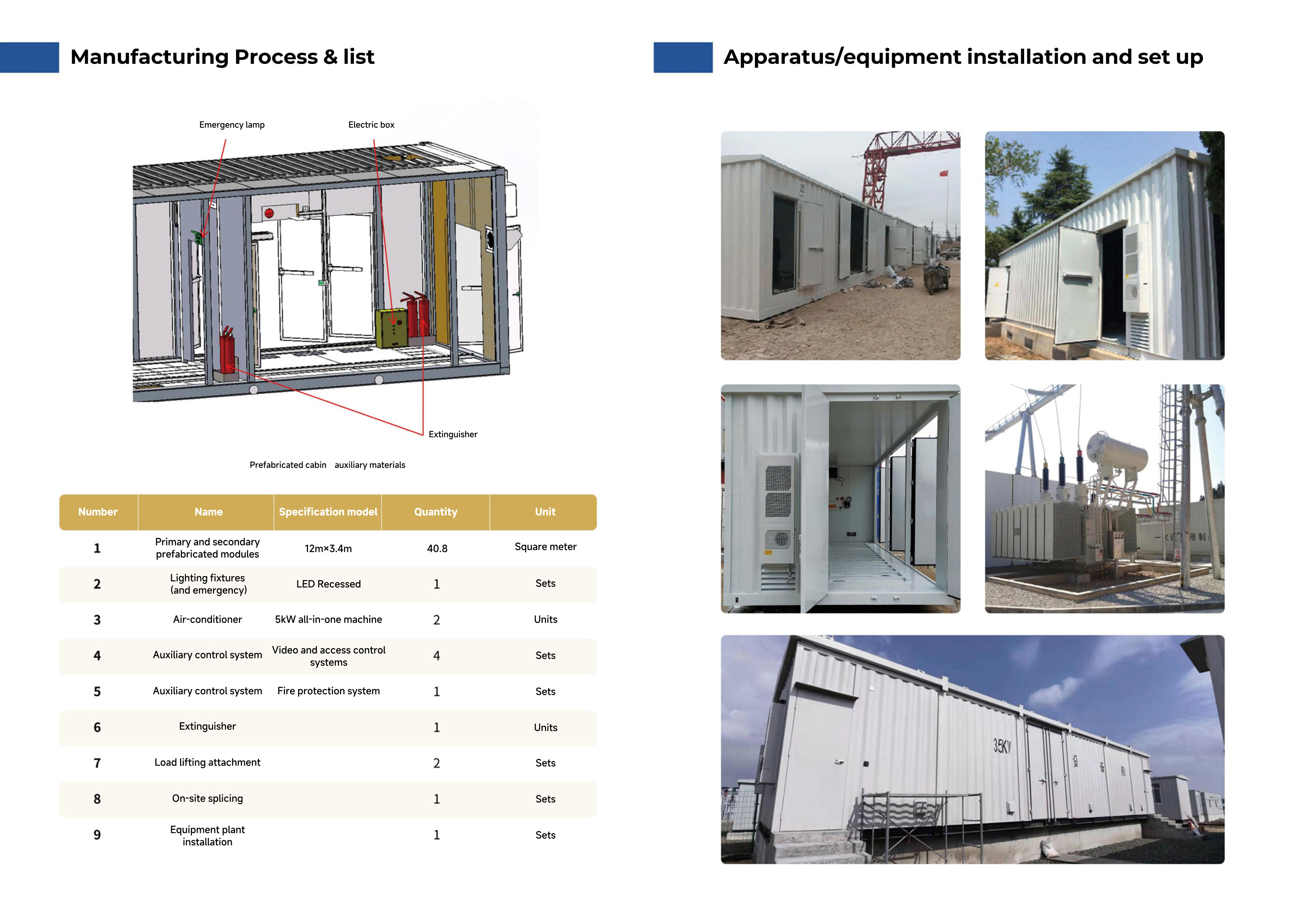 GIS prefabricated cabin is equipped with high-voltage GIS equipment, the cabin is equipped with SF6 gas monitoring and alarm and automatic ventilation system and other auxiliary functions to monitor the safe and reliable operation of the equipment, the product as a whole has the advantages of safety, reliability, small footprint, short construction period, long service life, flexible layout, etc., the use of modular design, flexible combinations, not subject to the limitations of the transport conditions, the cabin supporting the system has a comprehensive range of functions, and the beautiful appearance and various options, colour painting and fusion compatibility with the surrounding environment.