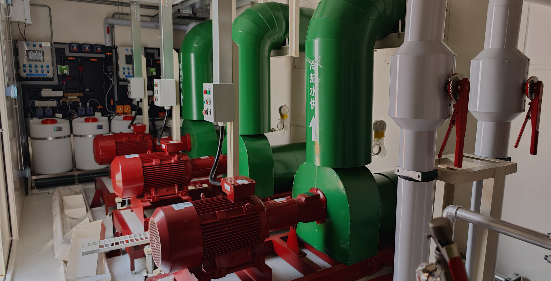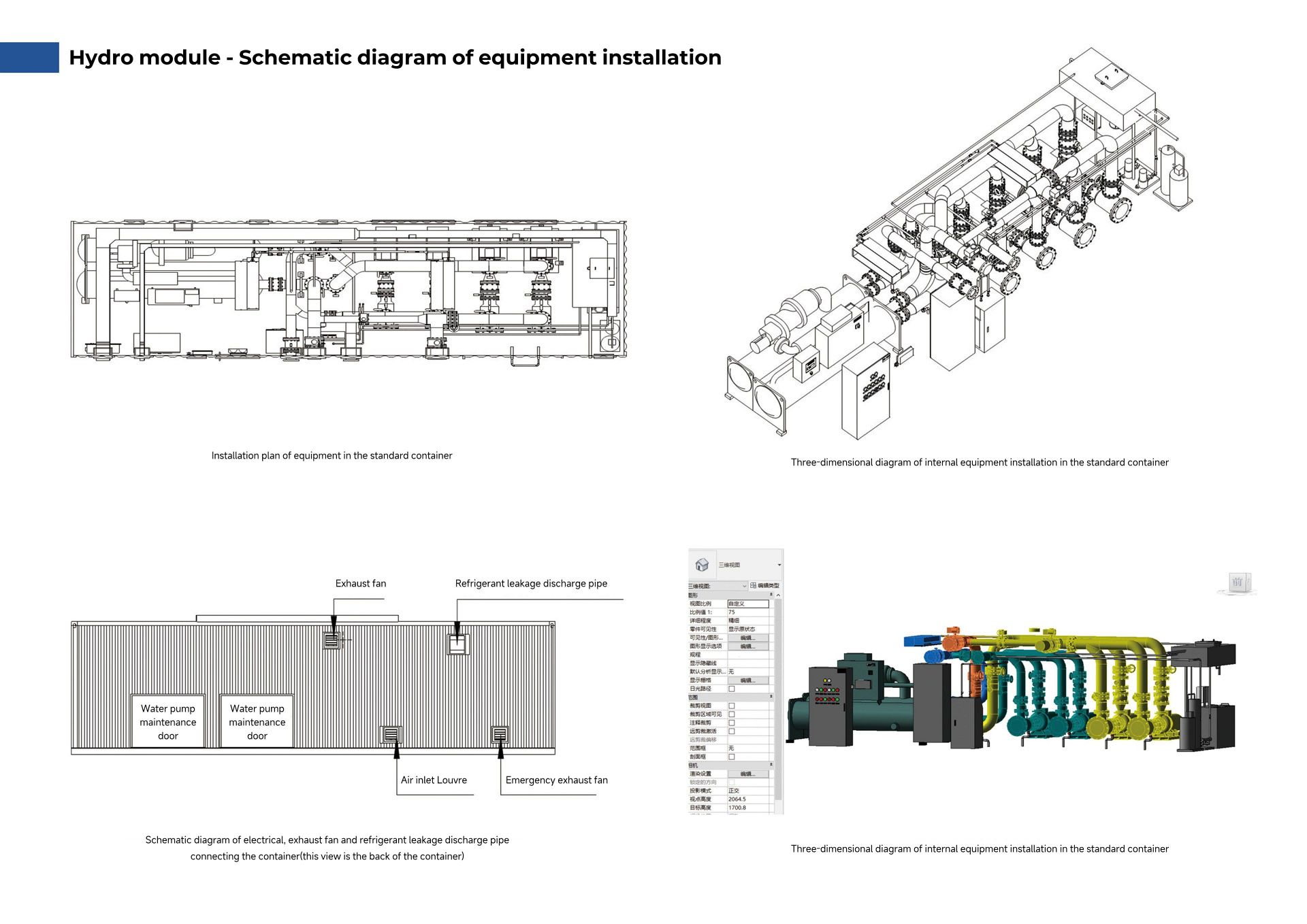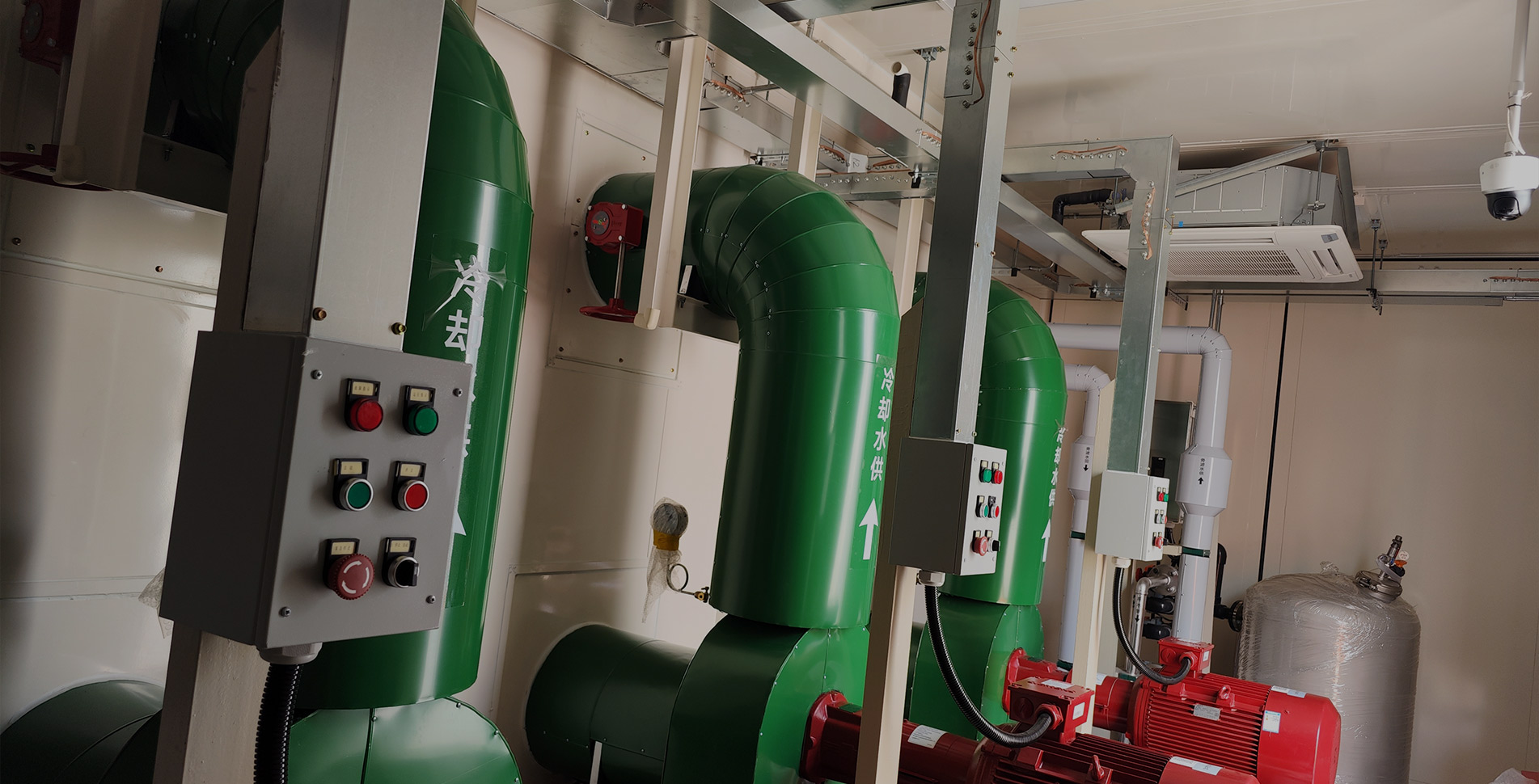 2. The modular water-cooled prefabricated cabin integrates water-cooling unit, variable frequency water pump, water treatment device and electrical control equipment. The system automatically adjusts water flow according to actual operating conditions and stable output cold capacity. The prefabricated cabin has its own control system for automatic adjustment.