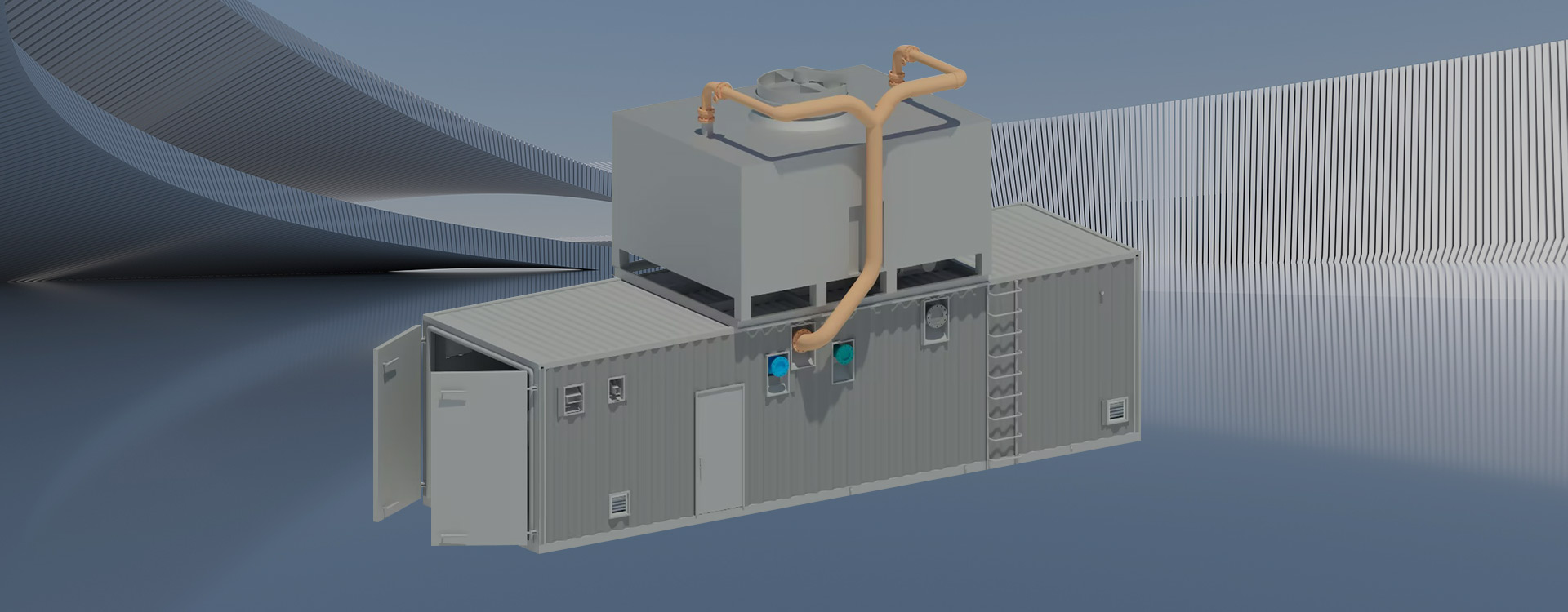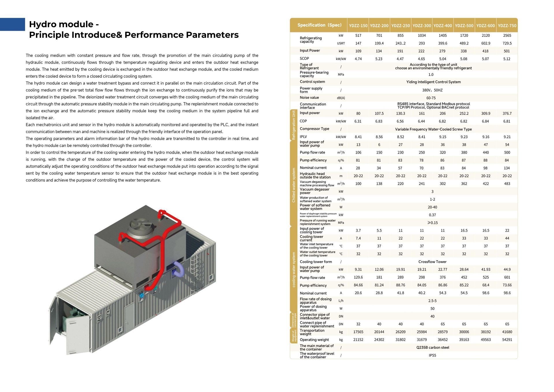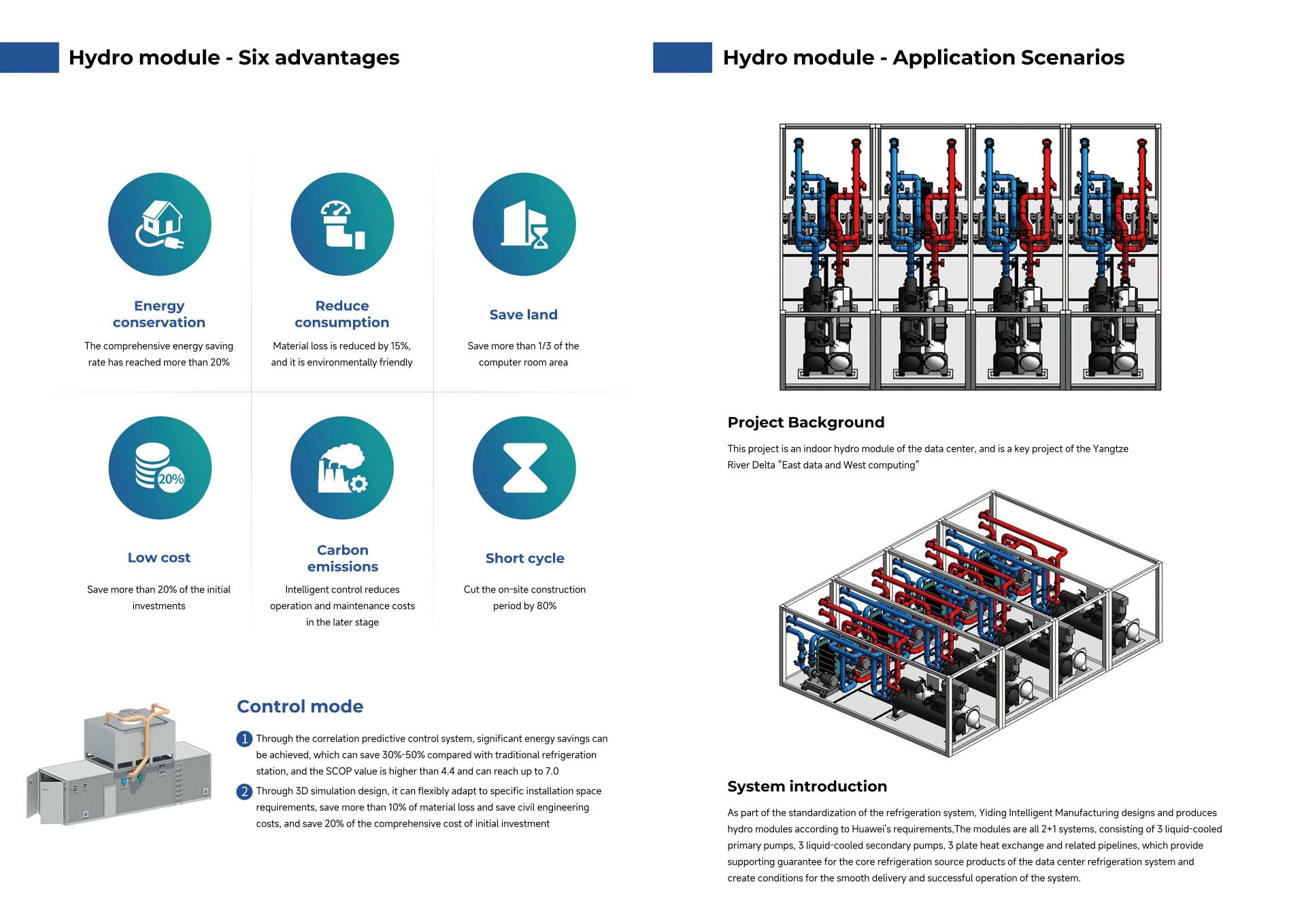 2. The modular water-cooled prefabricated cabin integrates water-cooling unit, variable frequency water pump, water treatment device and electrical control equipment. The system automatically adjusts water flow according to actual operating conditions and stable output cold capacity. The prefabricated cabin has its own control system for automatic adjustment.