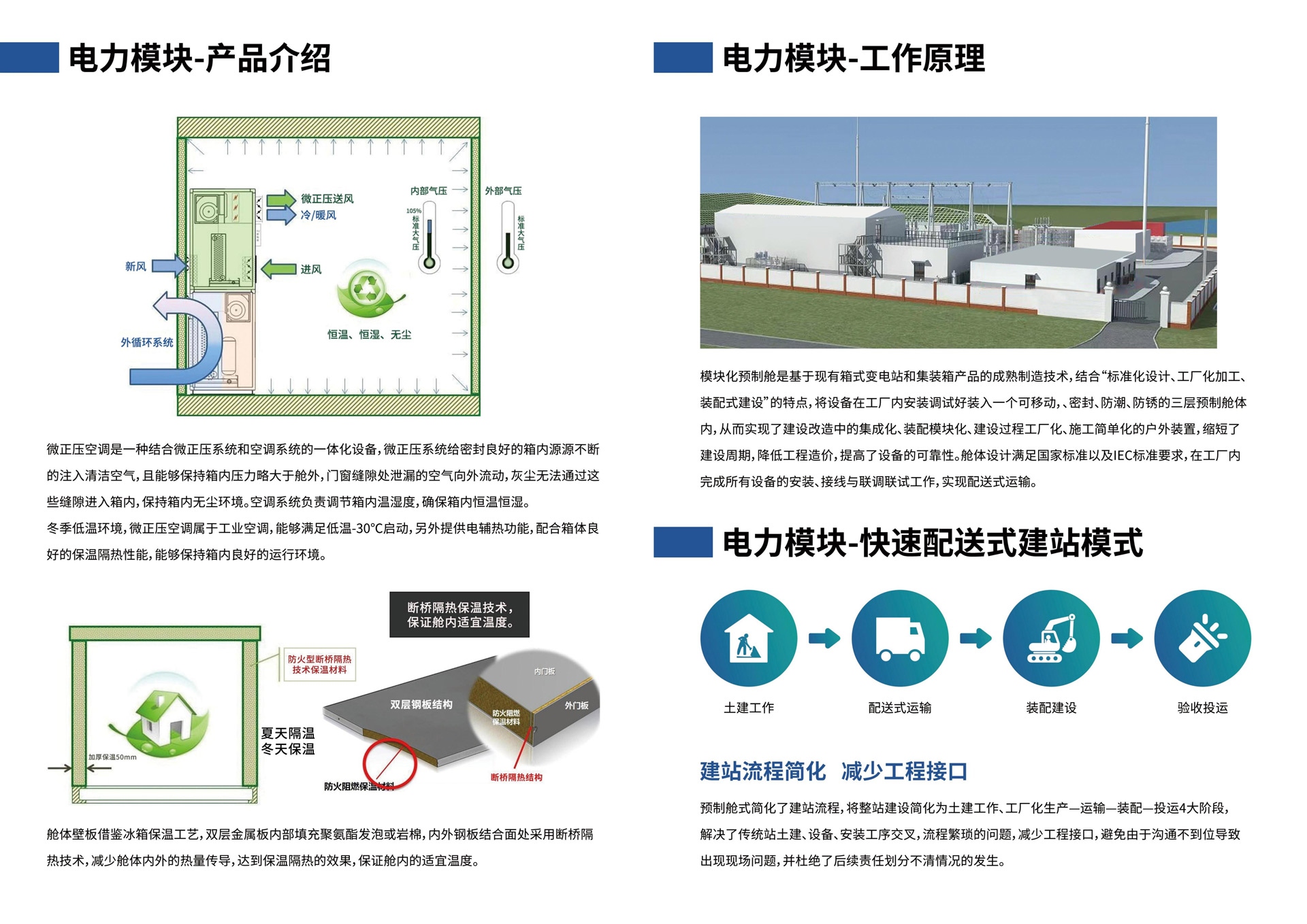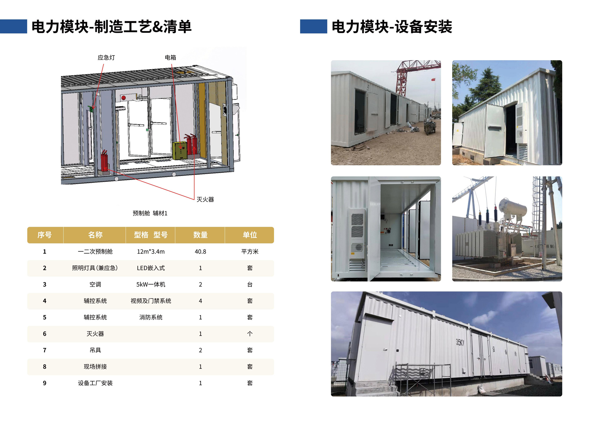 由预制舱体、柜体、一次设备、二次设备、舱体辅助设施等组成,在工厂内完成制作、组装、配线、调试等工作,以拼接单元形式分体运输至工程现场,就位安装。