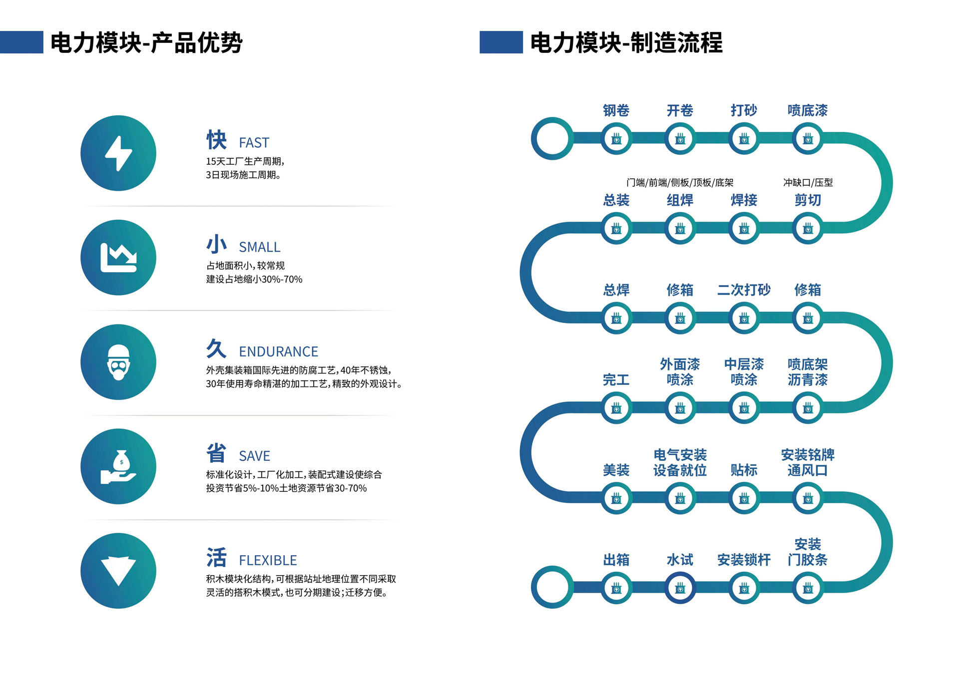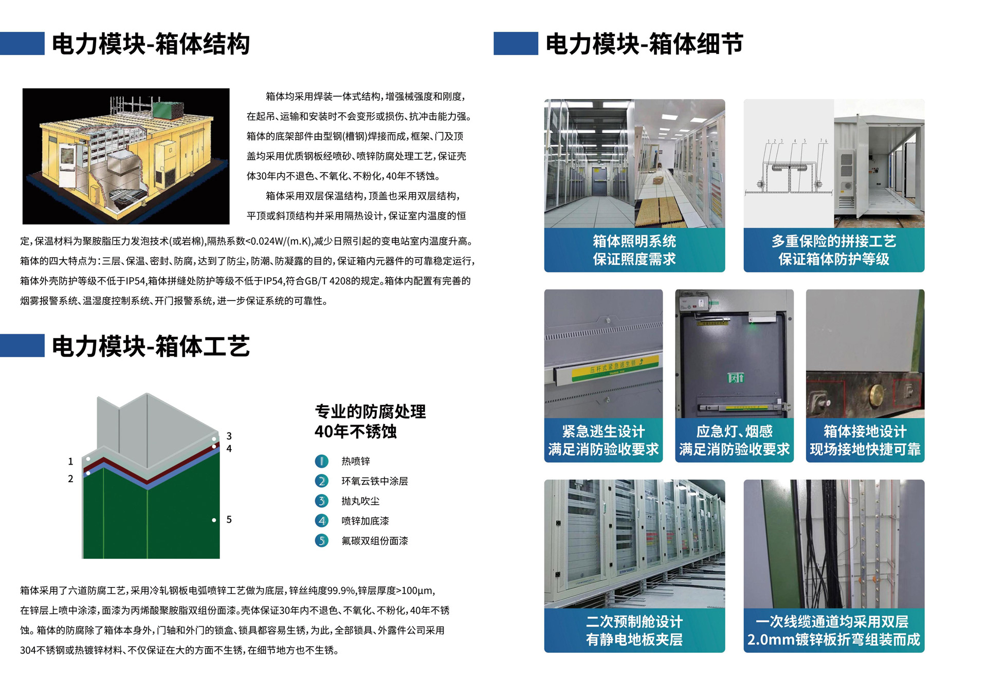 集成电气方舱,内部集变压器、进线柜、补偿柜、滤波柜、UPS、输入输出柜、维旁柜、馈线柜、气体灭火、精密空调、动环等设备于一体,简化了建站流程,将整站建设简化为土建工作、工厂化生产一运输一装配一投运4大阶段。