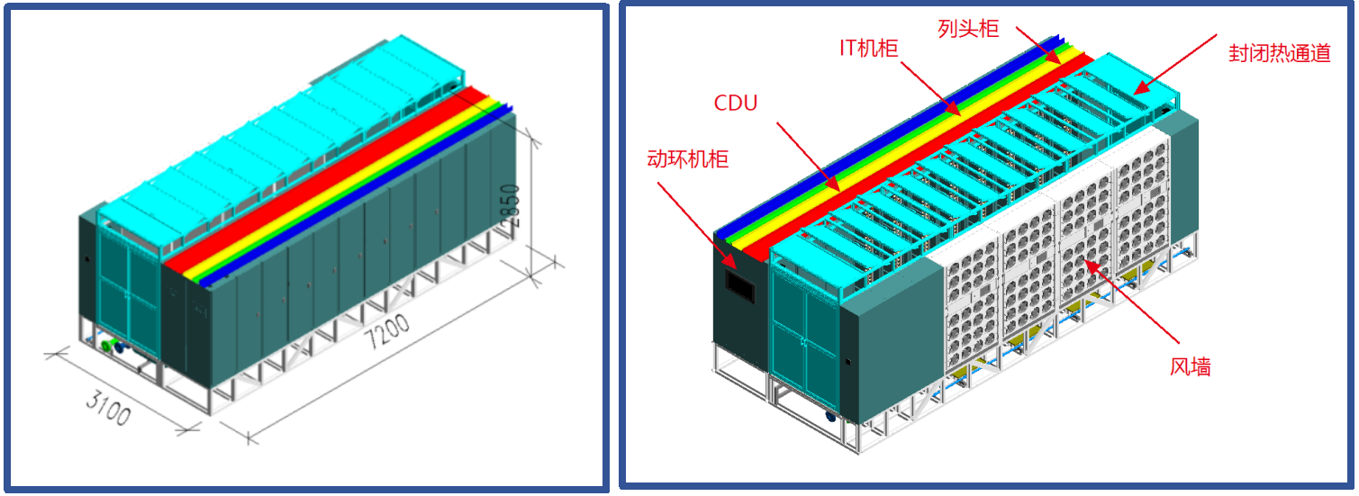 5)集成供配电、冷冻水风墙和冷冻水管路、CDU和二次侧管路以及manifold、机柜、动环管理等功能;