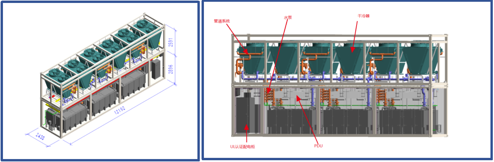 5)内部配置6台tank:制冷量大于189kW/台,最大支持250kW,相变氟化液;